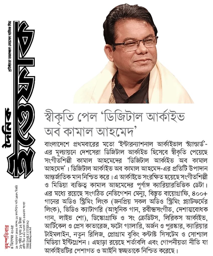 বাংলাদেশে প্রথমবারের মতো ‘ইন্টারন্যাশনাল আর্কাইভাল স্ট্যান্ডার্ড’-এর মূল্যায়নে দেশসেরা ডিজিটাল আর্কাইভ হিসেবে স্বীকৃতি পেয়েছে সংগীতশিল্পী কামাল আহমেদের ‘ডিজিটাল আর্কাইভ অব কামাল আহমেদ’। ডিজিটাল আর্কাইভ অব কামাল আহমেদ-এর প্রতিটি উপাদান আন্তর্জাতিক মান নিশ্চিত করে। এ আর্কাইভে সংরক্ষিত হয়েছে সংগীতশিল্পী ও মিডিয়া ব্যক্তিত্ব কামাল আহমেদের পূর্ণাঙ্গ ক্যারিয়ারভিত্তিক ডেটা। এর মধ্যে রয়েছে- সংগঠিত নেভিগেশন মেন্যু, বিস্তৃত বায়োগ্রাফি, ৪০০+ গানের অডিও স্ট্রিমিং লিংক (জনপ্রিয় সকল অডিও স্ট্রিমিং প্ল্যাটফর্মের লিংক), ভিডিও ক্যাটেগরি (আধুনিক গান, রবীন্দ্রসংগীত, দেশাত্মবোধক গান, লাইভ শো), ডিস্কোগ্রাফি ও সং ক্রেডিটস, লিরিকস আর্কাইভ, আর্টিকেল ও প্রেস কাভারেজ, ফটো গ্যালারি, অর্জন ও পুরস্কার, ক্যারিয়ার টাইমলাইন, নতুন রিলিজ, প্রোগ্রাম বুকিং কন্ট্যাক্ট সিসটেম ও সোশ্যাল মিডিয়া ইন্টিগ্রেশন। এ ছাড়া রয়েছে শর্তাবলী এবং গোপনীয়তা নীতি- যা আর্কাইভটির পেশাগত ও আইনি স্বচ্ছতাকে নিশ্চিত করেছে।